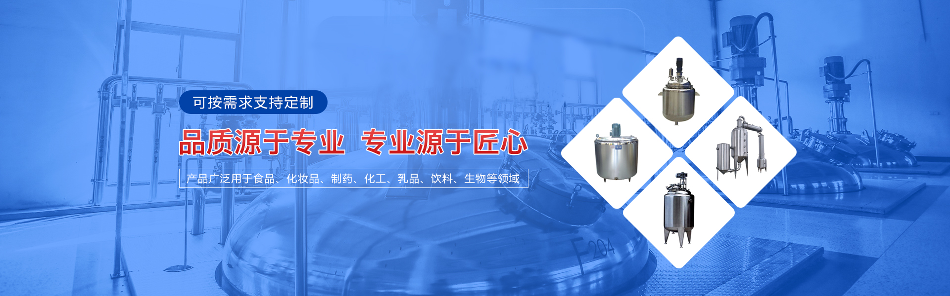 主要經(jīng)營各種機械設(shè)備的制造、加工、銷售,主要產(chǎn)品有攪拌罐、冷熱缸、發(fā)酵缸、乳化罐、貯罐、移動罐、夾層鍋、調(diào)配罐、脫氣罐、方槽、電加熱調(diào)配罐等各種食品機械和制藥機械。產(chǎn)品廣泛被用于食品、化妝品、制藥、化工、乳品、飲料、生物等領(lǐng)域,深受新老客戶的信賴與好評。